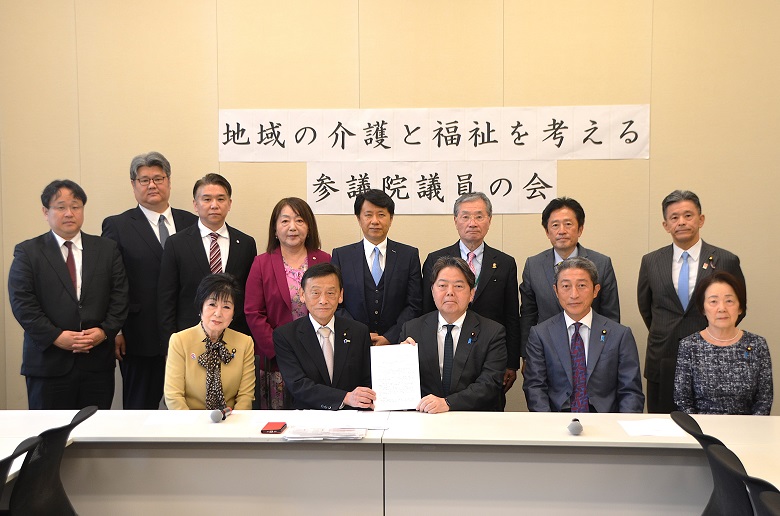 自民党の「地域の介護と福祉を考える参議院議員の会」(末松信介会長)は24日、2027年度の介護報酬改定を待つことなく賃上げと物価高騰への対策を可能とする「特段の措置」を検討するよう求める申入書を林芳正官房長官に手交した。この議員連盟が9日に実施した介護関係5団体へのヒアリングで、介護と他産業との賃金格差は2024年度に月8.3万円に拡大し、人材の流出が生じているなどの訴えがあったことから、介護分野の処遇改善に向けた早急な対応を求めている。【渕本稔】