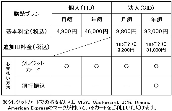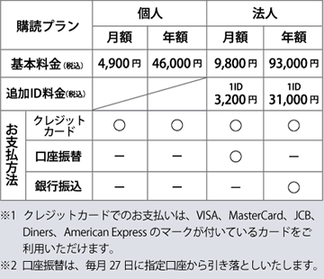 購読プラン個人プラン個人名義でご購読いただく場合は、1 ID ごとのご契約となります。毎月お支払いいただく月額プランとお得な年額プランをご用意しております。 法人プラン法人名義でご購読いただく場合は、1 契約で 3 IDを発行させていただきます。毎月お支払いいただく月額プラン・一括払いの年額プランいずれも、1ID あたりの料金が大変お安くなり、お得です。 価格・お支払い方法全プラン、開始月は無料! ![]() |