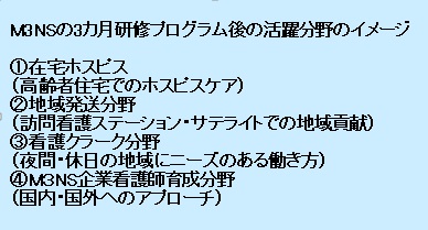 M3NSでは、これまで病院や診療所に勤務して、訪問看護に興味を持っている看護師を研修プログラムの受講対象としている。急性期、慢性期を問わず病棟経験は3年超程度を想定している。