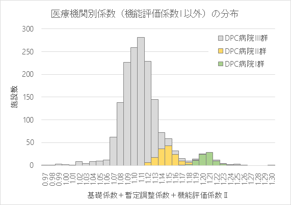 まず、基礎係数と暫定調整係数、機能評価係数IIの合計値の分布を見た=グラフ1=。DPC病院I群、II群は、III群に比べ高い値に分布していることが分かる。