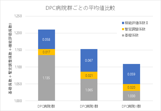 DPC病院I群、II群の方が高い値になっているのは、基礎係数の違いである=グラフ2=。また、DPC病院II群は、機能評価係数IIについて、他の群より少し高くなっている。