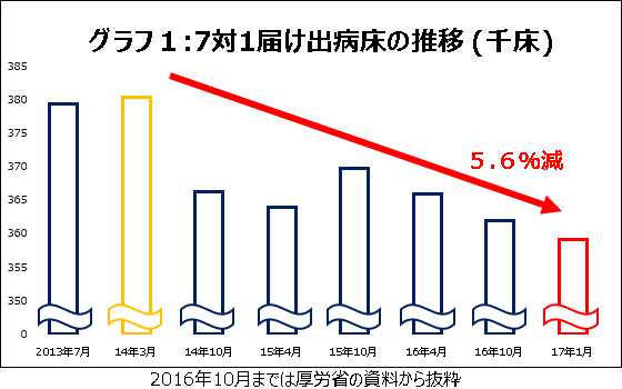 一般入基料の7対1は、看護職員を手厚く配置し、重症度の高い患者を受け入れる病院を評価する診療報酬項目。点数が高いことから、06年度に創設されてからしばらく、届け出病床数が増加。14年3月時点で38万床以上が届け出ていた。