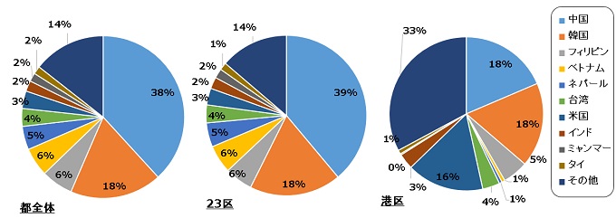 都によると、1月1日現在、東京の在留外国人の数は48万6346人。これを国・地域別で見ると、中国が38%とトップで、次いで韓国(18%)、フィリピン、ベトナム(いずれも6%)などと続く。こうした傾向は23区全体でも変わらないが、港区に限ると、米国の割合が10ポイント以上高くなる=グラフ=。