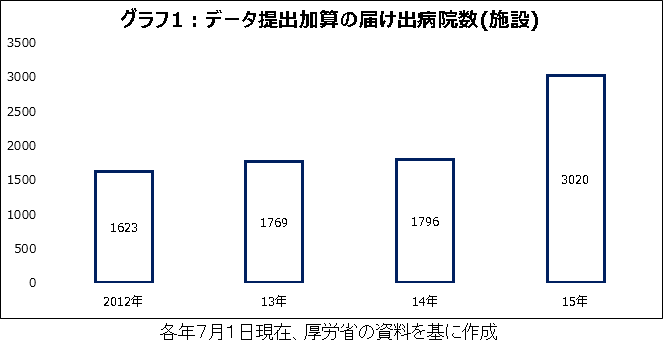 また同改定で厚生労働省は、7対1を届け出るための要件に、データ提出加算の届け出を追加。新設した「地域包括ケア病棟入院料」などでも、同加算の届け出を要件と定めたことから、同加算の届け出病院数は同年7月からの1年間で大きく伸びた=グラフ1=。