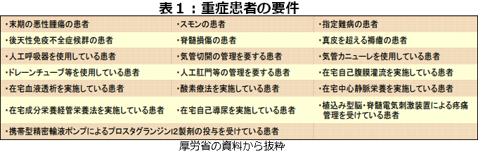 点数が最も高いのは患者が「重症患者」の場合で、2番目は「重症患者」以外だが月2回以上の訪問診療を要する場合。一方、月1回のみの訪問診療で十分に管理できる場合は点数が低い。「重症患者」は、「人工呼吸器を使用している」「末期の悪性腫瘍」といった要件=表1=に当てはまる患者と規定されている。