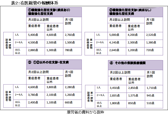 昨年春の改定後の在医総管の点数は、同じ建物に住んでいる患者数によっても異なる。同じ建物に10人以上の患者が住んでいる場合は点数が低いが、その患者が「重症患者」だと比較的高い点数を算定できる=表2=。在宅患者がサービス付き高齢者向け住宅などに住んでいる場合に、在医総管の代わりに算定する施設入居時等医学総合管理料も評価体系は同様だ。