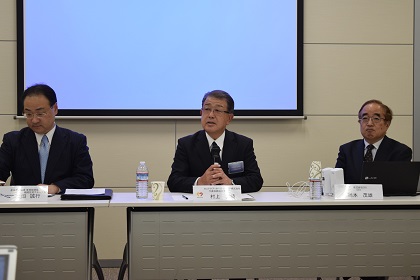 記者会見するセントケアHDの村上美晴会長(中央、14日、東京都内)