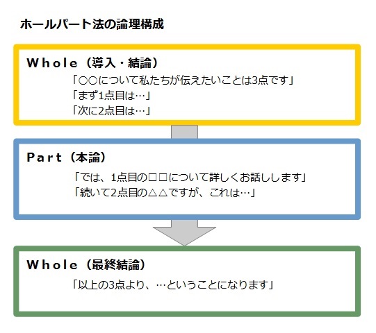 まず1つ目の「ホールパート法」ですが、これは短時間で正確にメッセージを伝えるためによく使われる論理構成法です。その名の通り全体【Whole】と部分【Part】を使う構成法で、【Whole】→【Part】→【Whole】という構成になります。