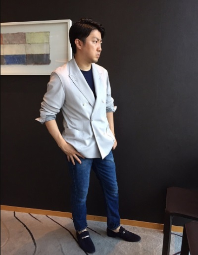 お気に入りのジャケットでポーズを取る横山さん(出所:UOMOウェブサイト)
