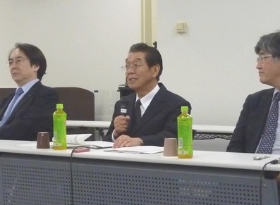 記者会見する吉村理事長=中央=(12日、東京都内)