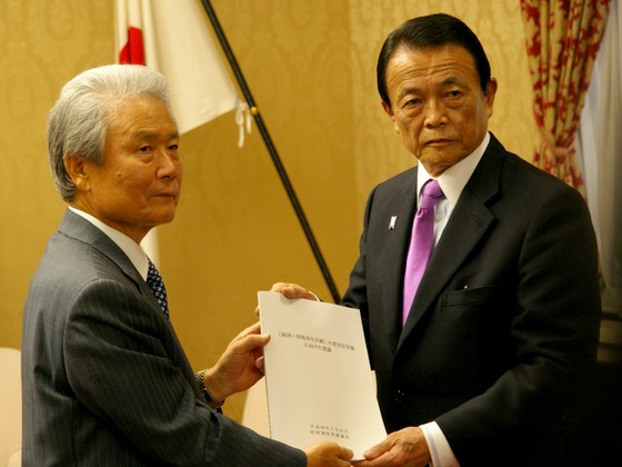 提言を麻生財務相=右=に手渡す財政審の榊原定征会長
