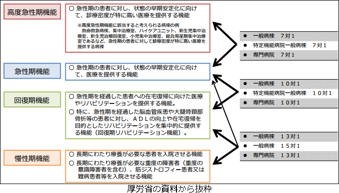 厚労省案は、一般病棟入院基本料などを届け出る病棟を、7対1や10対1といった看護配置の区分ごとに「一般的」な医療機能と結び付けるもの=図=。13対1や15対1の病棟について、主に回復期か慢性期の機能を選ぶよう促すが、急性期機能としての報告を「妨げるものではない」(同省担当者)としている。