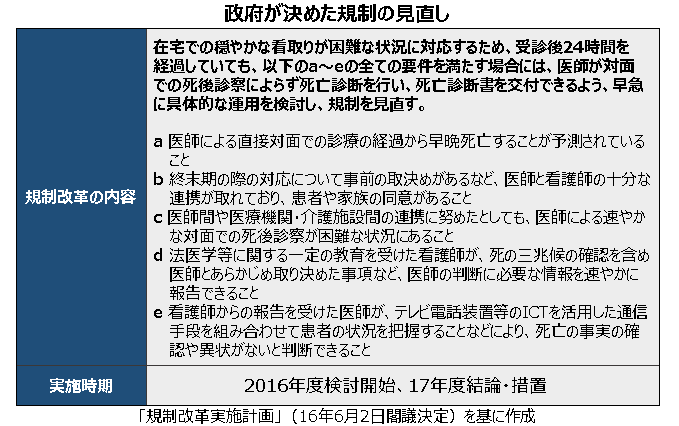 医師が死亡診断書などを交付しないと、埋葬や火葬の許可が下りない。そのため、医師不足の地域などでは遺体を保存して医師の死後診察を待つケースや、自宅での看取りを諦めるケースがあるとの指摘があった。これを受けて政府が昨年6月、そうした患者が最期まで住み慣れた場所で過ごしやすくなるように、ルールの見直しを決めていた=表=。