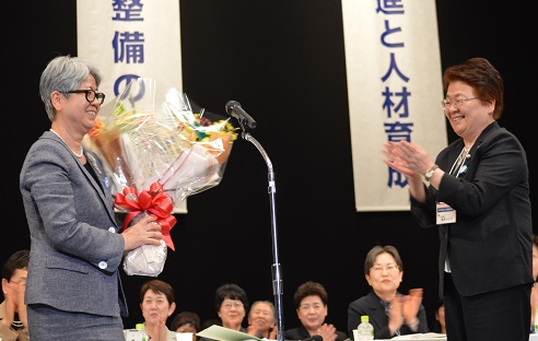 坂本すが前会長=左=をねぎらう福井会長(6月7日、幕張メッセ)