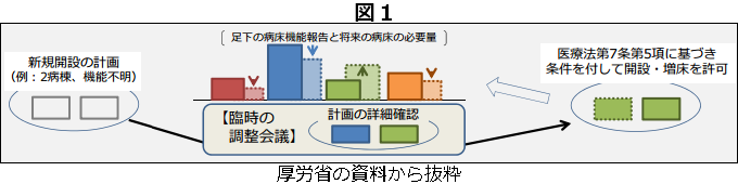 また病院の新設や、増床の計画があると分かった場合にも、その関係者を含めて調整会議を開くべきだと指摘。雇用や設備面の見通しが、その病院が担うつもりの医療機能と見合っているかを確認し、地域で不足する医療機能を担うように、都道府県から求めるべきかどうか検討する必要性も挙げた=図1=。