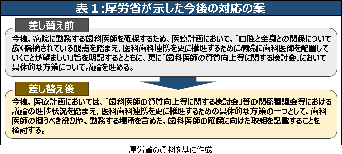 同省は今月に入ってから、この日の会合の資料をホームページに掲載した。ただ、歯科医師の配置を促す案は削除され、「歯科医師の担うべき役割」や「勤務する場所を含めた、歯科医師の確保に向けた取組」を医療計画に記載する案へと差し替えられている=表1=。