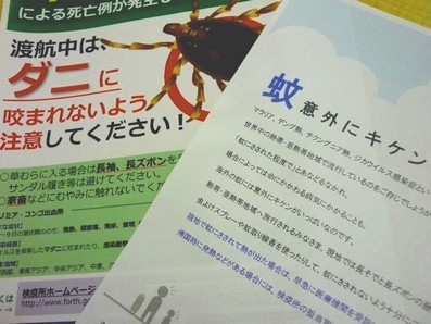 蚊媒介感染症の予防策を記載したポスターとダニに注意を呼び掛けるリーフレット