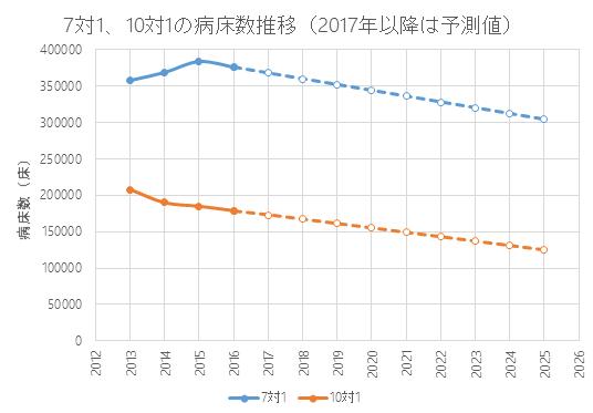 グラフ1 7対1、10対1の病床数推移(2017年以降は2015-2016年のペースで変化し続けることを想定した予測値)