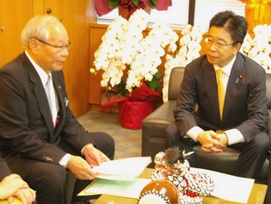 加藤厚労相(写真右)に受動喫煙防止対策に関する要望を伝える日医の横倉会長(10日、厚労省)