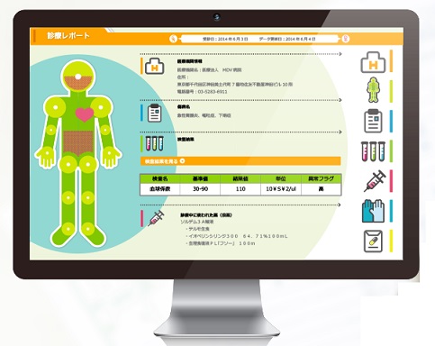 ※ インターネットサイト「カルテコ」により患者は、身体をイメージした「診療レポート」(左)のページを確認できる。そこでは、受診日や医療機関情報はもちろん、傷病名や処置・手術などのほか、検査結果や処方された薬剤の名称を把握することが可能。これらの診療・検査データを基に、ほかの医療機関でセカンド・オピニオンを聞くことができたりする。どのような薬剤が処方されているかが分かるため、重複投与やポリファーマシー(多剤処方)問題の解決にもつながる。