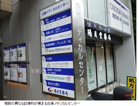 陽月堂薬局が1階にある6階建ての「白楽メディカルセンター」ビルは、内科、小児科、耳鼻咽喉科・アレルギー科、産婦人科、歯科といった診療科が異なる複数のクリニックが集まる医療モールだ。日本医薬は、陽月堂薬局以外にも、歩いて3分程度の所にある西神奈川薬局を運営している。その薬局の店舗のあるビルも医療モールで、整形外科、眼科、腎臓内科(人工透析)のクリニックが開業している。
