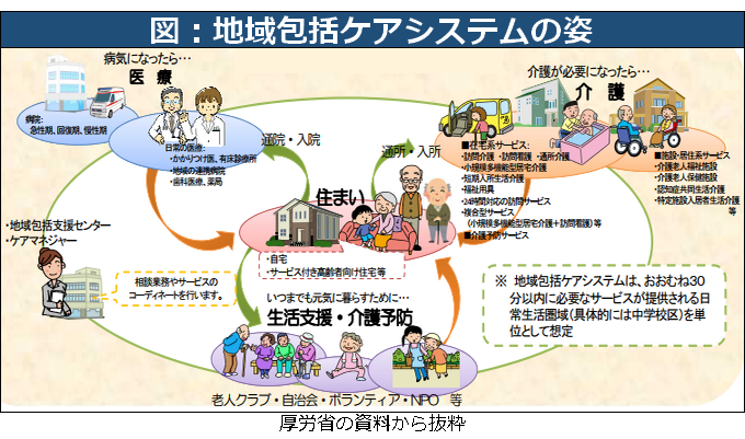 各地で構築が進む地域包括ケアシステムでは、高齢の患者が在宅で療養できるように医療・介護などのさまざまなサービスで支え、必要なときだけ入院する姿を厚労省は描いている=図=。つまり、そうした患者は基本的に在宅療養することになる。退院支援を担当する病院職員には、退院が難しい事情を抱える患者をより積極的にサポートし、在宅復帰させることが求められる。
