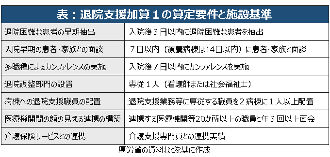 そうした積極的な支援への評価として、昨年度の診療報酬改定で「退院支援加算1」が新設された。緊急入院の患者や認知症を持つ患者を早期に把握し、家族との話し合いなどを進めると退院時に算定できる。施設基準は退院支援の担当者を手厚く配置することや、連携先の医療機関など20カ所以上の担当者と定期的に情報共有することなどだ=表=。