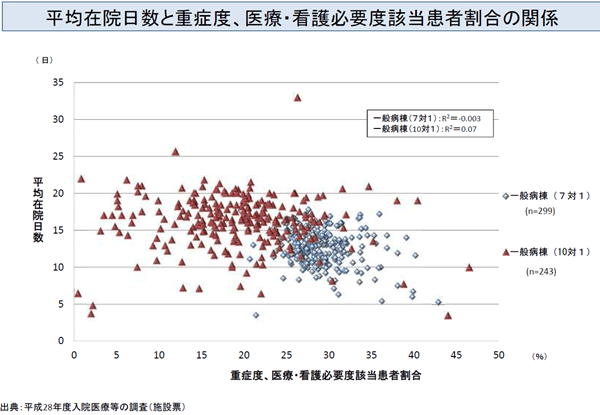 グラフ1 平均在院日数と重症度、医療・看護必要度該当患者割合の関係
