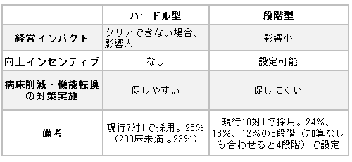 分科会では、このような分布が示され、7対1のように看護必要度のハードルを設定するのがよいのか、10対1のように看護必要度の割合に応じた段階的な加算を設定するのがよいのか、さまざまな議論が行われた。看護必要度を厳格化する上で、前者の「ハードル型」の制度はクリアできない場合の経営インパクトが大きい。そのため、クリアできない場合、病床削減・機能転換等の対策を講じる可能性が高いだろう。また、看護必要度が既に25%を超えている病院に、さらに向上を促す動機付けが難しい。一方、後者の段階的評価制度は身の丈に合った加算を算定できるため、経営インパクトは比較的小さく、最上位の加算を算定している病院以外は、さらなる上の加算を目指す動機付けとなる。ただし看護必要度が低くても、病床削減や機能転換をする可能性は低くなる=表1=。
