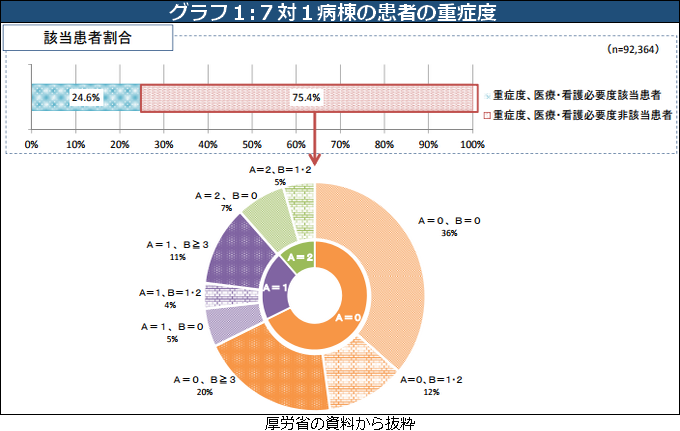 現行ルールでは、行った処置などの状況をA得点、必要とする介助の状況をB得点、手術などの実施状況をC得点としてそれぞれ看護職員らが評価し、その結果が「A2点以上かつB3点以上」といった条件を満たせば重症者と見なす。調査では、重症者と見なされない「非該当患者」の36%はA・B・Cの全得点がゼロだった=グラフ1=。