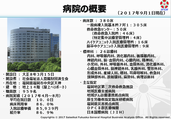 福岡市にある当院は、福岡地区の3次救急医療機関、地域医療支援病院、地域がん診療拠点病院として、救急患者、紹介患者を受け入れ、高度専門医療を積極的に推進している。市内には2つの大学病院と複数の基幹病院が点在し、医療資源が豊富な一方で、激戦区と呼ばれている地域である。