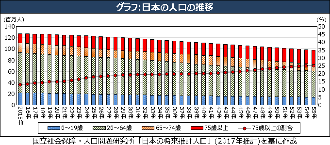 さらに今後、高齢化の高い波が押し寄せます。2025年には人口ボリュームが大きい団塊世代が75歳以上になり、その時点で75歳以上の人が総人口の17.8%を占めます。55年には、4人に1人(25.1%)が75歳以上になると推計されます=グラフ=。