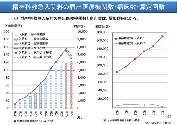 なぜ、精神科救急入院料の届け出が増えているのか。措置入院と医療保護入院が増加傾向にあることが、要因の1つとして挙げられる。精神科救急入院料の施設基準を満たすには、年間の新規患者のうち、▽措置入院▽緊急入院▽医療保護入院▽応急入院▽鑑定・医療観察法入院―の患者が6割以上を占める必要がある。