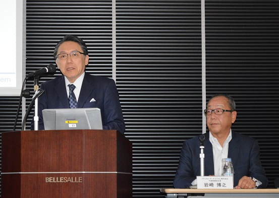 神野理事長(左)と岩崎社長(8日、東京都内)