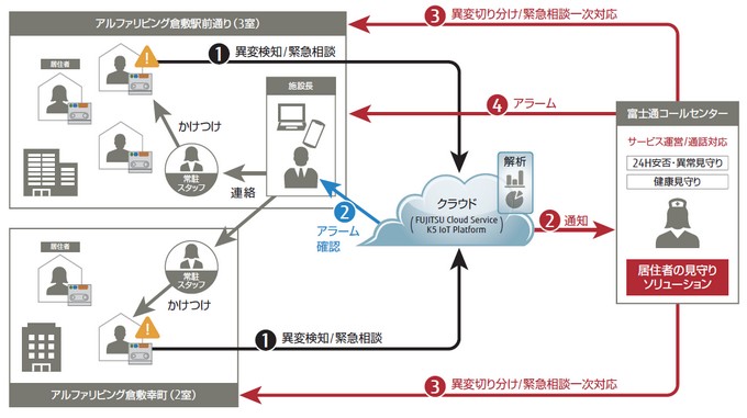 実証実験の第1弾では、緊急通報受信事業の分野で30年以上の実績がある「富士通コールセンター」が、入居者の生活気配などの見守りを行った。第2弾では、「アルファリビング倉敷駅前通り」の控室でパソコンを使って入居者の様子を見守った。