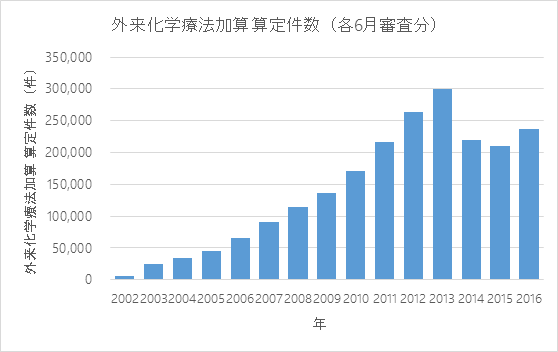 外来化学療法加算の算定件数は、年々増えている=グラフ1=。2014年と15年は一時的に減少しているが、これは診療報酬改定による外来化学療法加算の対象見直し=図1=の影響によるものと理解している。