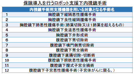 ロボット支援手術の保険適用は、2017年度まで腹腔鏡下腎悪性腫瘍手術と腹腔鏡下前立腺悪性腫瘍手術のみだったが、18年度診療報酬改定では、12の術式=表=でも算定が可能になり、範囲が拡大した。ただし、報酬については既存の腹腔鏡手術などと同じで、医療提供者側からは、コスト面などで見合わず、赤字だといった声も多い。