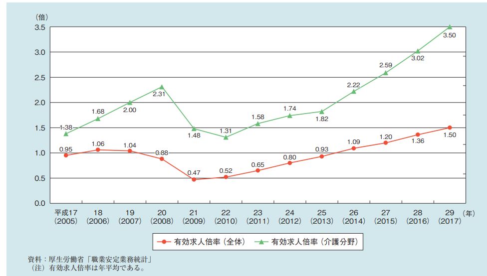 「人材難でしょう」という私の問いに、「それがね、そんなに困ってはいなくてね」と、ある介護事業所の経営者は答えました。他の事業所でも「今のところ間に合っていて」と余裕がある様子です。あれれ、人材難じゃないの? それほど深刻ではないという経営者に出会う一方で、2018年版高齢社会白書(内閣府)では17年の介護分野の有効求人倍率は3.50倍で、全産業の有効求人倍率1.50倍の約2.3倍となっています。新卒募集だけでなく、年間通して中途採用の門戸を開き、採用枠を前年の倍にしたものの応募がなく、派遣社員に頼らざるを得ない事業所もたくさんあります。