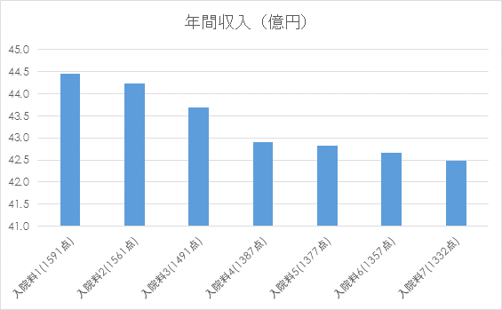 ある病院の例だが、入院料2-7を算定した場合、入院料1のときに比べ年に数千万円から2億円近く減収する=グラフ1=。