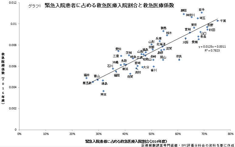この連載の第35回「地域差に影響されない救急医療係数の設計を」では、2016年度の救急医療係数と緊急入院患者に占める救急医療入院の割合に強い相関があることを指摘した=グラフ1=。