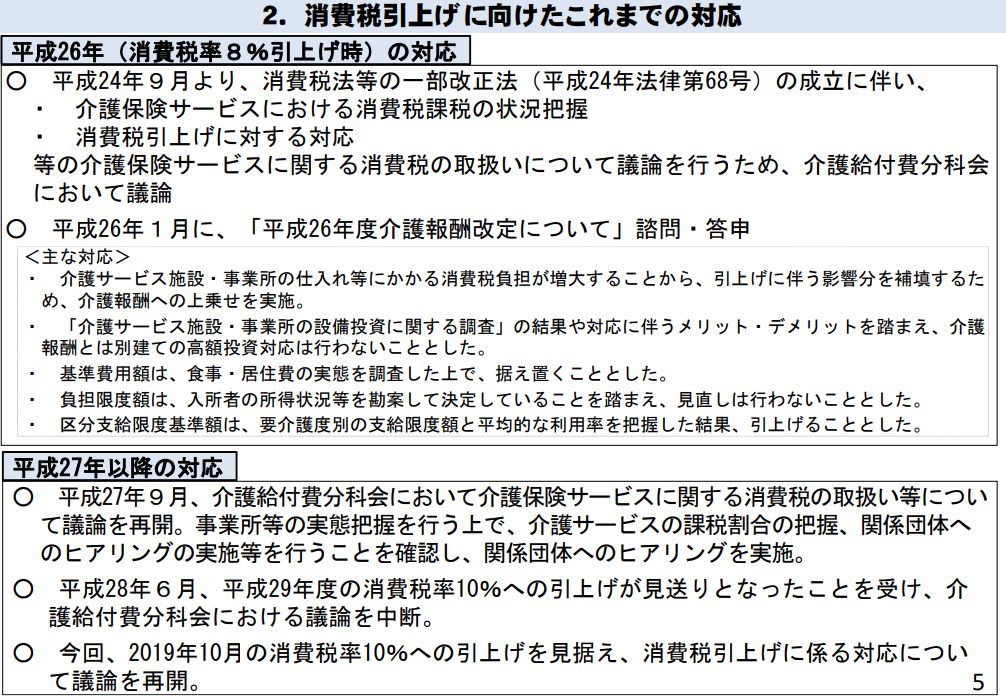 2019年10月に予定されている消費税率10%への引き上げに伴う、介護保険サービスに関する消費税の取り扱いについて、社会保障審議会介護給付費分科会は15日の会合で、関係3団体へのヒアリングを行った。各団体からは食費・居住費の負担に伴う基準費用額の見直しや、人材不足による介護職員などの人材派遣増加に伴う消費税負担が大きいなどの意見が出された。【齋藤栄子】