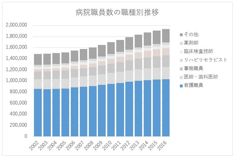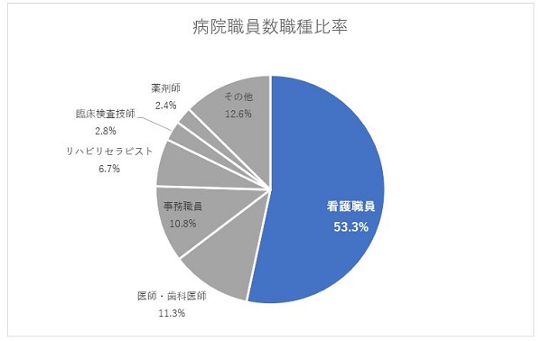 看護職員の割合は、病院職員の半数以上を占めている=グラフ1=。