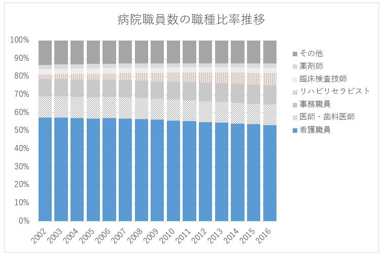 グラフ 2 病院職員数の職種比率推移厚生労働省 病院報告(2012-16年)を基に作成