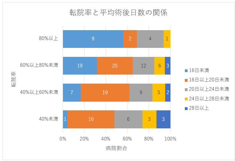 転院率の高い病院は術後日数が短く、転院率の低い病院は術後日数が長くなっている。病院個別で見れば、術後日数が長くなる理由はさまざまあると考えられるが、「転院させる・させない」の違いが在院日数に影響を及ぼしていることが示唆される結果である。