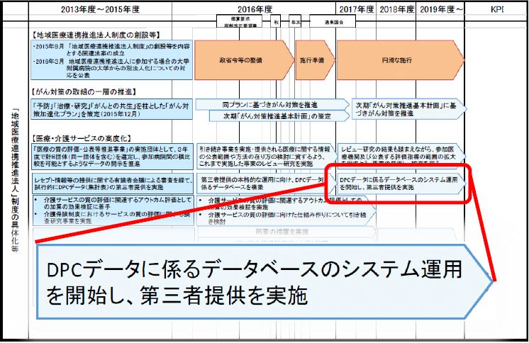 第三者提供についてはこれまで、政府の高度情報通信ネットワーク社会推進戦略本部が「新たな情報通信技術戦略工程表」で、DPCデータの第三者提供の形態とガイドライン策定の検討を行うことを10年に決定し、レセプト情報等の提供に関する有識者会議で「DPCデータの提供に関するガイドライン」が策定・承認された。また、「日本再興戦略2016工程表」=資料1=には、17年度からの第三者提供の実施が盛り込まれた。