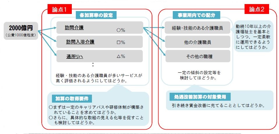 介護人材の処遇改善については、介護職員処遇改善加算などを設けてこれまで取り組みを進めてきた。これらをさらに進めるため、保険料と公費で合計2000億円の財源を投じて、介護サービス事業所における勤続年数10年以上の介護福祉士の賃金水準を、全産業の平均程度にまで引き上げる処遇改善を行うことを目的に、分科会で論議を進めてきた。