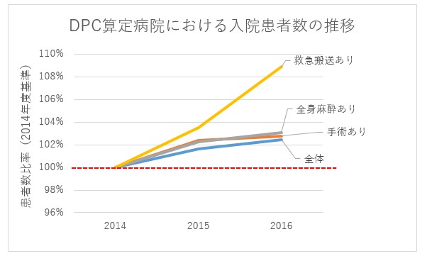 DPC算定病院では、入院患者数が2014年度から16年度で2%以上伸びている=グラフ1=。入院患者を「手術あり」や「全身麻酔あり」などの特徴で分類した増加率と比較してみると、この2つは全体の伸び率とほぼ同じだが、「救急搬送あり」の伸び率は、8%を上回る大きな値になっている。