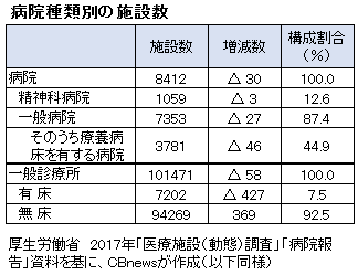 病院病床の内訳を見ると、一般病床89万865床(同533床減)、療養病床32万5228床(同2933床減)、精神病床33万1700床(同2558床減)で、療養病床と精神病床でやや病床が減っている。
