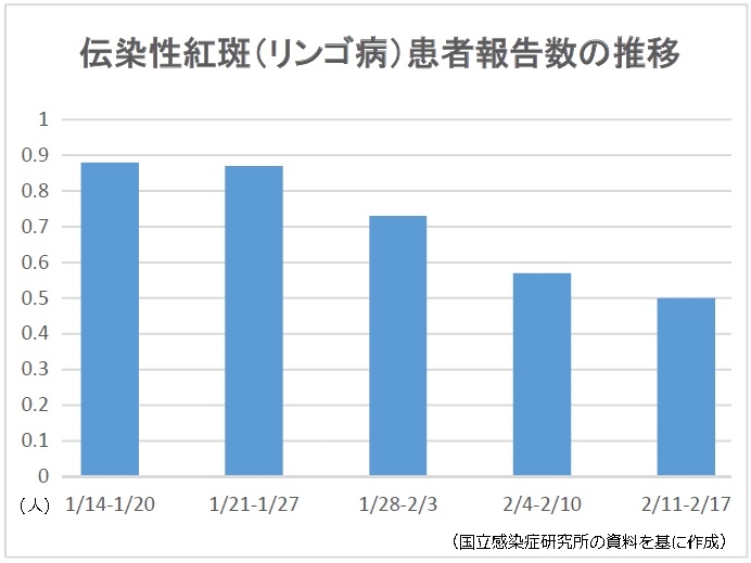 〔伝染性紅斑〕報告数は前週比約12.2%減の0.5人。過去10年の同期と比べて2番目に多い。都道府県別の上位3位は、宮城(1.75人)、新潟(1.63人)、山形(1.6人)。 〔感染性胃腸炎〕報告数は前週比約15.6%減の5.09人。都道府県別...