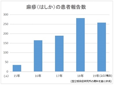 同研究所によると、19年の患者報告数(2月27日現在)は258人。過去10年間で最も多かった09年を上回るペースで増えている。 都道府県別では、大阪が94人で最も多く、以下は、三重(50人)、愛知(25人)、東京(19人)、神奈川(...